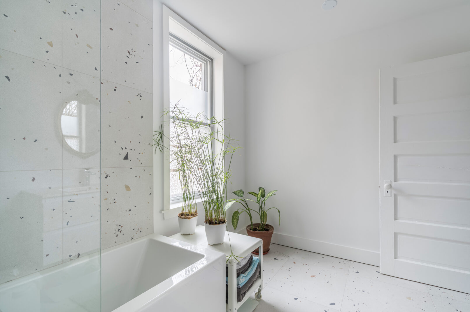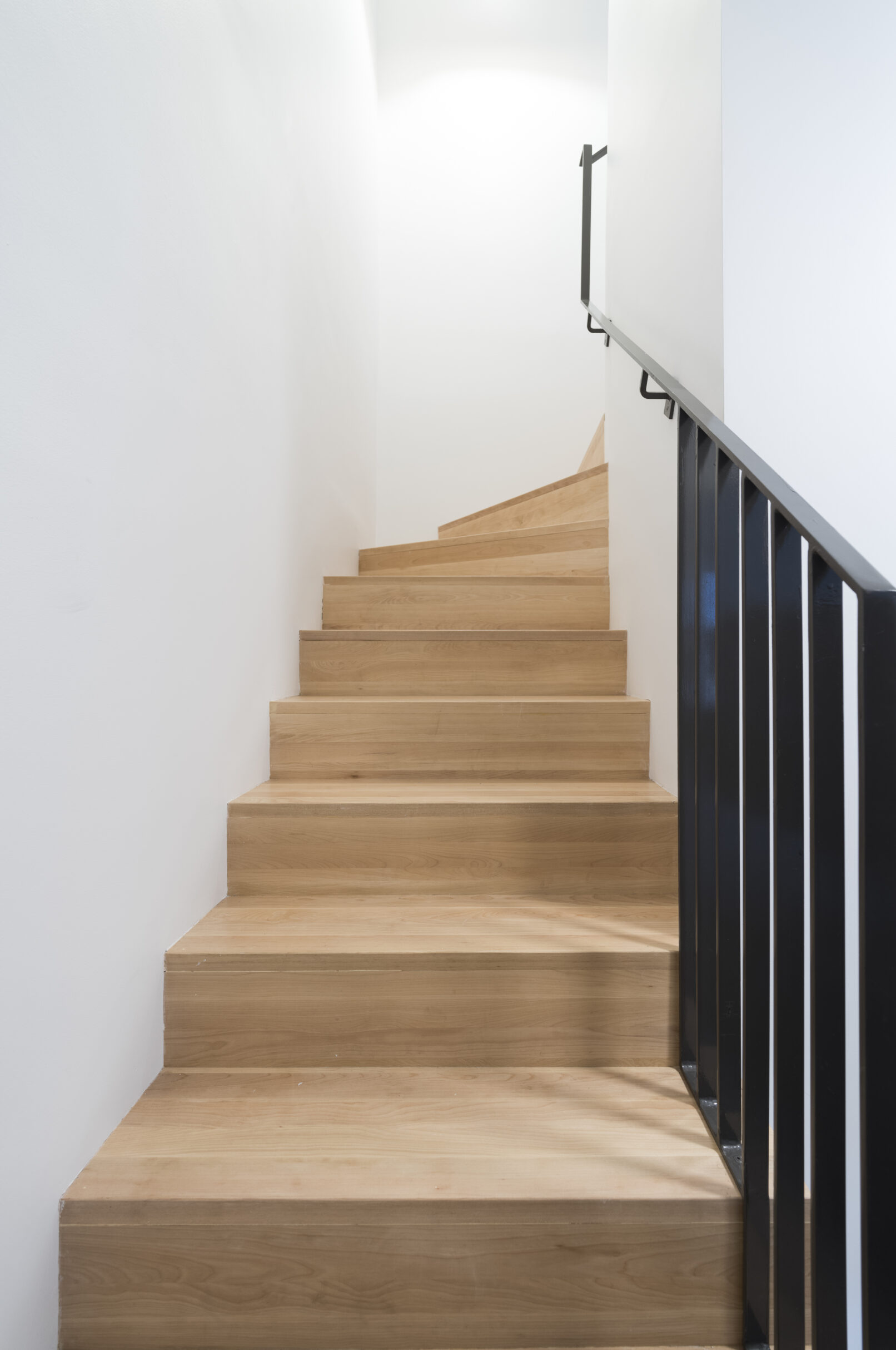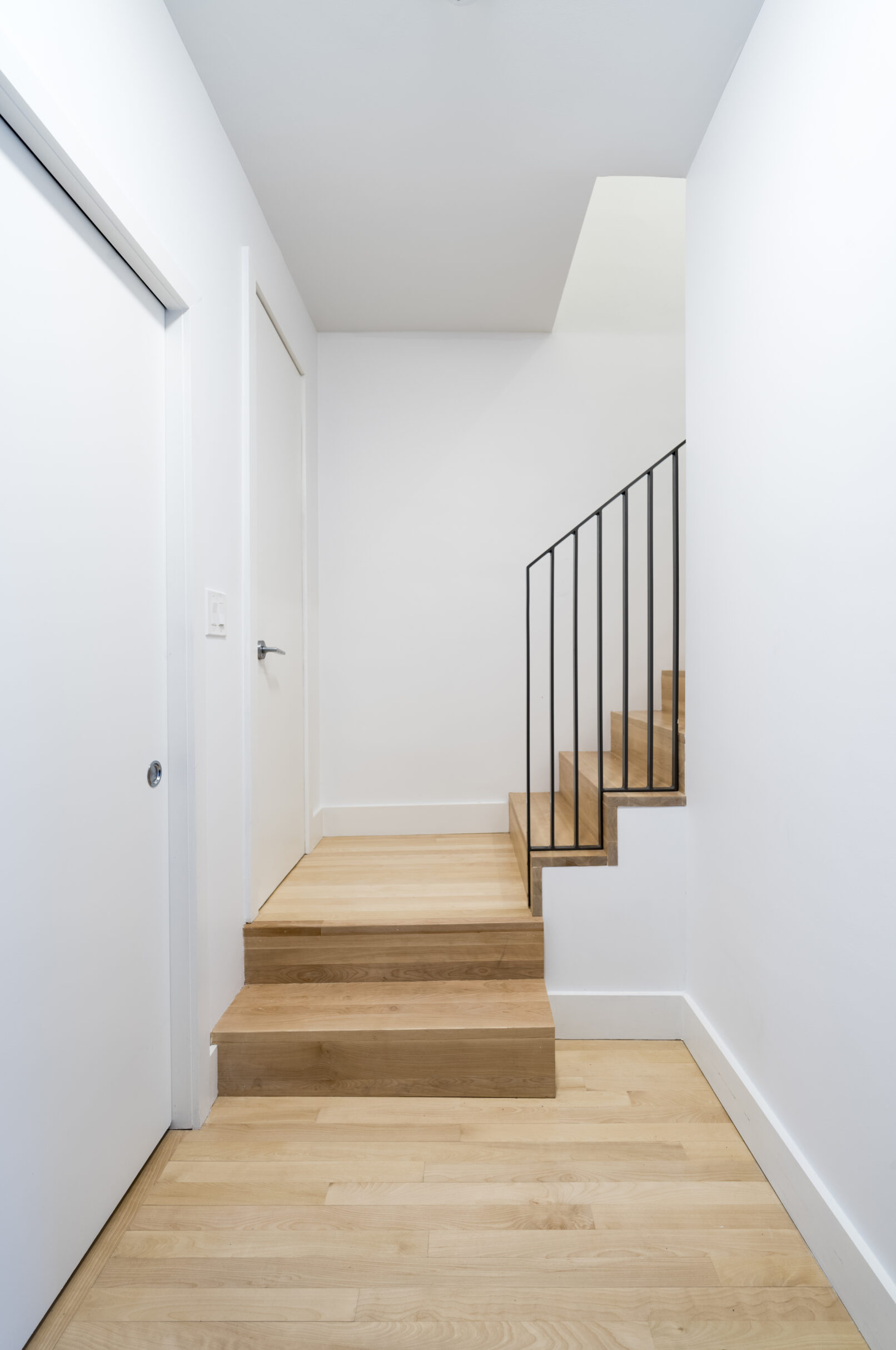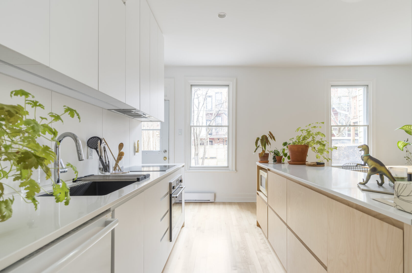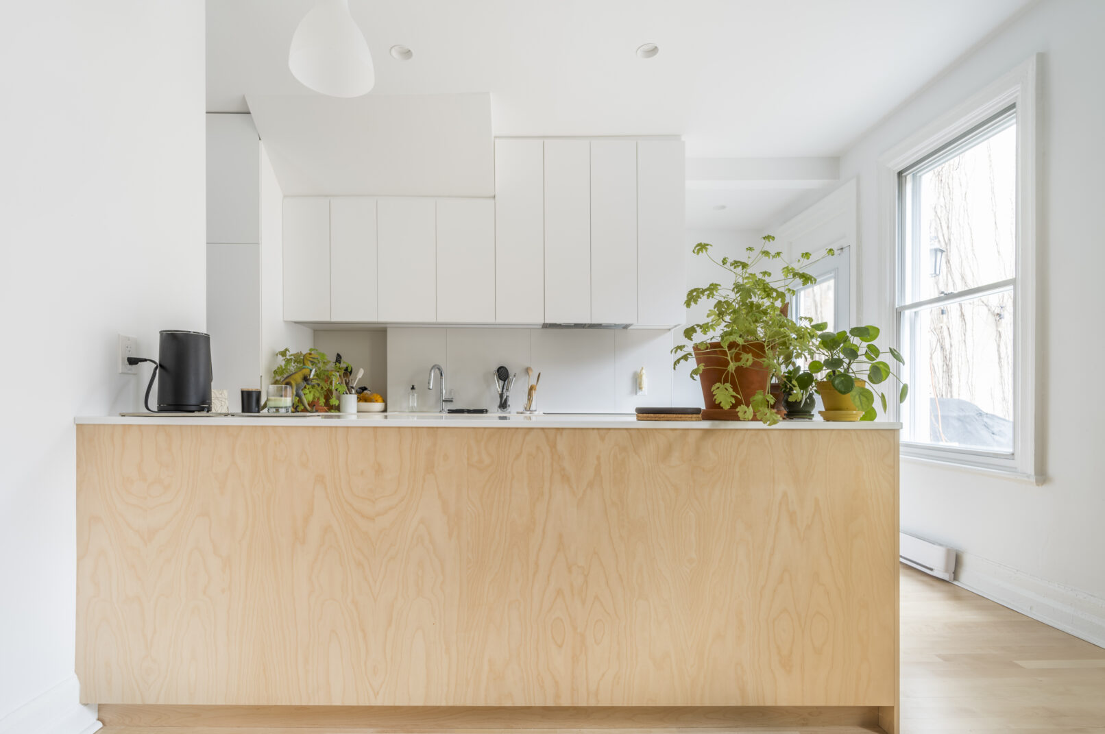 Ce projet d’architecture intérieure est né du souhait des propriétaires de réorganiser les espaces de vie. La relocalisation de l’escalier intérieur menant au sous-sol pour créer des aménagements fonctionnels a permis de maximiser l’espace au rez-de-chaussée. Désormais, la nouvelle cuisine conçue sur mesure, l’ajout d’une nouvelle salle d’eau, ainsi que la transformation de la salle de bains au 2e niveau, créent un environnement accueillant. Le choix de matières naturelles tel que le bois contribue à l’ambiance chaleureuse de la maison.